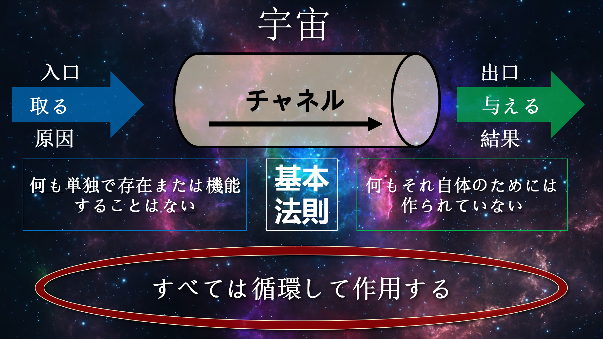 宇宙は想像できないほど広大です。それでも、私たちは五感による経験を通じて、一般的な原則を理解できます。私はある関連性を発見しました。これを「宇宙の基本法則」と呼んでいます。ミクロコスモス(小宇宙)とマクロコスモス(大宇宙)のすべての要素は、この法則の下でのみ機能します。この基本法則は、単純で理解しやすい二つの原則から成り立っています。それは、「何も単独で存在または機能することはない」、また「何もそれ自体のため(それ自体の利益のため)には作られていない」という原則です。