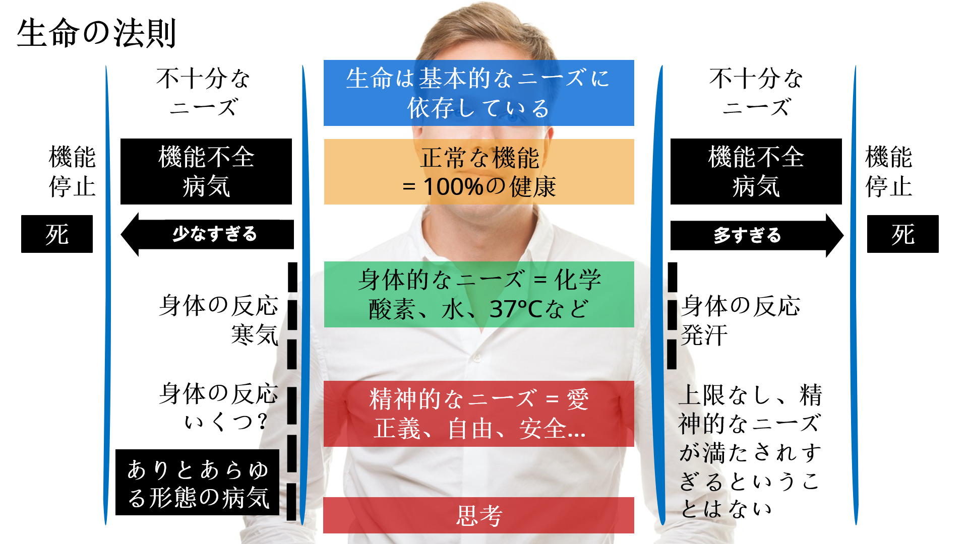 生命が基本的なニーズの充足に依存していることは容易に理解できます。「生命の法則」は私たちが人間として必要とするものを制御しています。関連するニーズすべてが最適な範囲内で満たされていれば、私たちの状態は「少なすぎる」境界線と「多すぎる」境界線の間を移動します。そうすればすべてが正常に機能し、私たちは完全に健康な状態となります。この状態では、病気は発生しないでしょう。