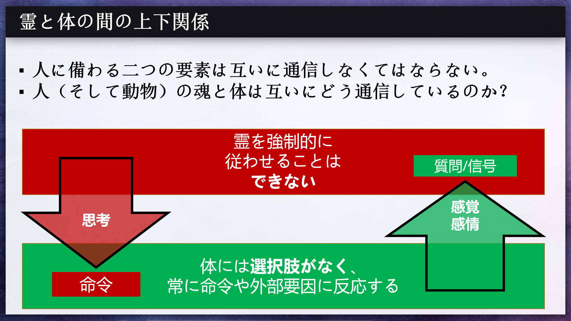 これは、霊が物質のように命令できる要素ではないことをはっきり示しています。霊は内側から自らをコントロールするため、提供された情報が自らの精神的なニーズを満たすかどうかを確認する必要があります。ニーズを満たす何かを提供された場合、それを受け入れ、それに従って行動します。そうでない場合、提供されたものに従った行動はしません。つまり、霊は選択肢として明確に「いいえ」と示すことができます。これは物質にはできないことです。