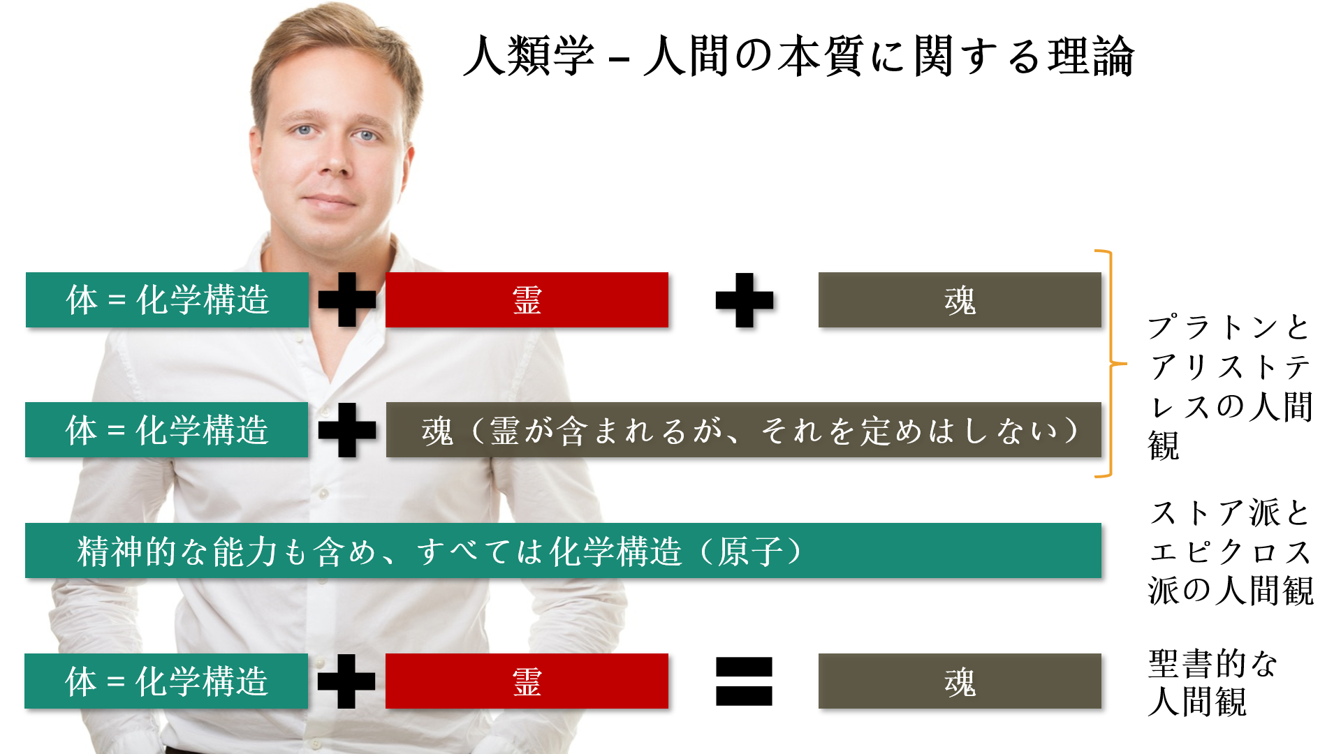 1. 一方では、人間は三つの独立した実体、すなわち「体」、「霊」、「魂」の相互作用であると見なされています。魂と霊は精神的な実体です。この人間観は古代ギリシャ人によって形作られたため、「プラトンとアリストテレスの人間観」と呼ばれています。プラトンは人間を、「動物の体に閉じ込められた神」として非常にはっきりと描写しています。したがって、死は人間にとって一種の解放なのです。人間は再び神になります1。