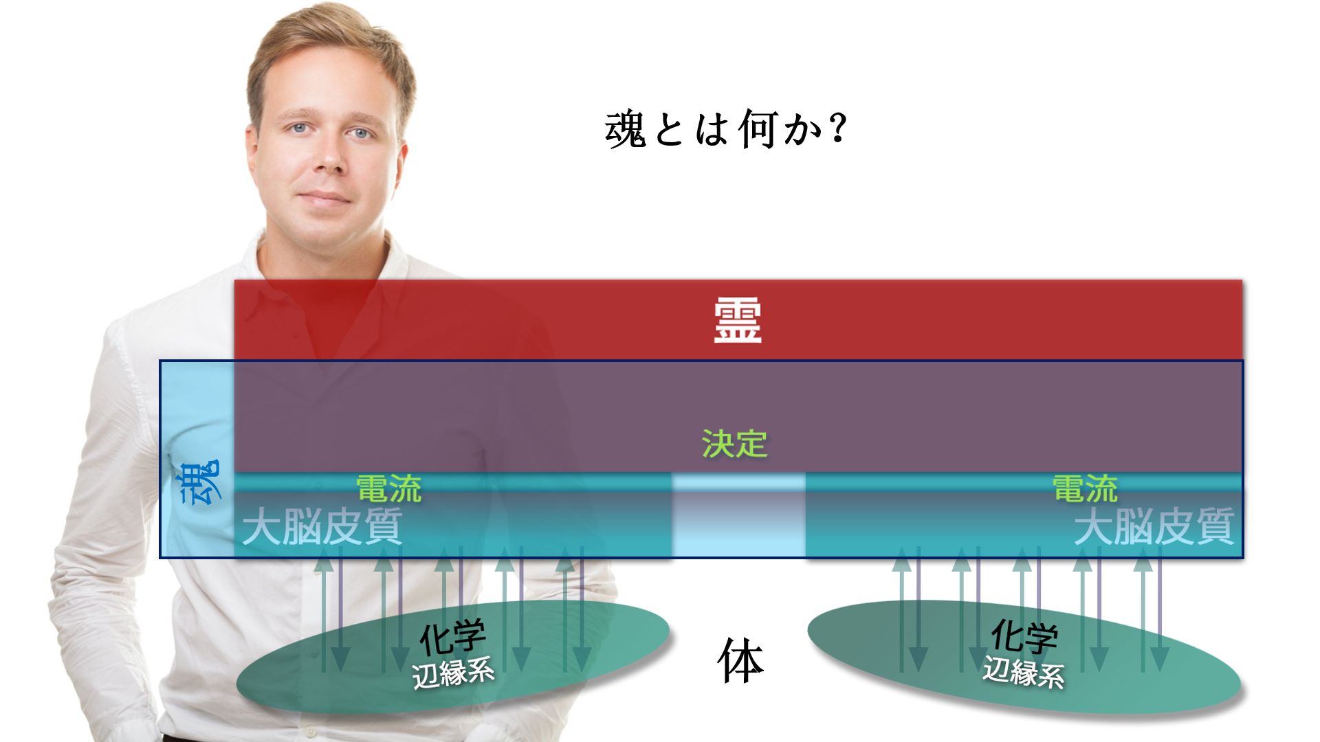 3. これまで述べてきたことに照らして、「物質だけでは人間を説明できない」という否定できない証拠があります。自然の法則によれば、体は、体そのものだけでは生み出せない力によってコントロールされる必要があります。したがって、人間が二つの要素、つまり「体」と「霊」から成り立っていると見なすのは理にかなっています。第三の要素は見つけられませんでしたが、体と霊の相互依存性——つまり一方は他方なしには何もできないという依存性——に基づいて、「魂」という用語はこの事実を適切に表現しています。したがって、人間は霊と体から成る魂なのです。