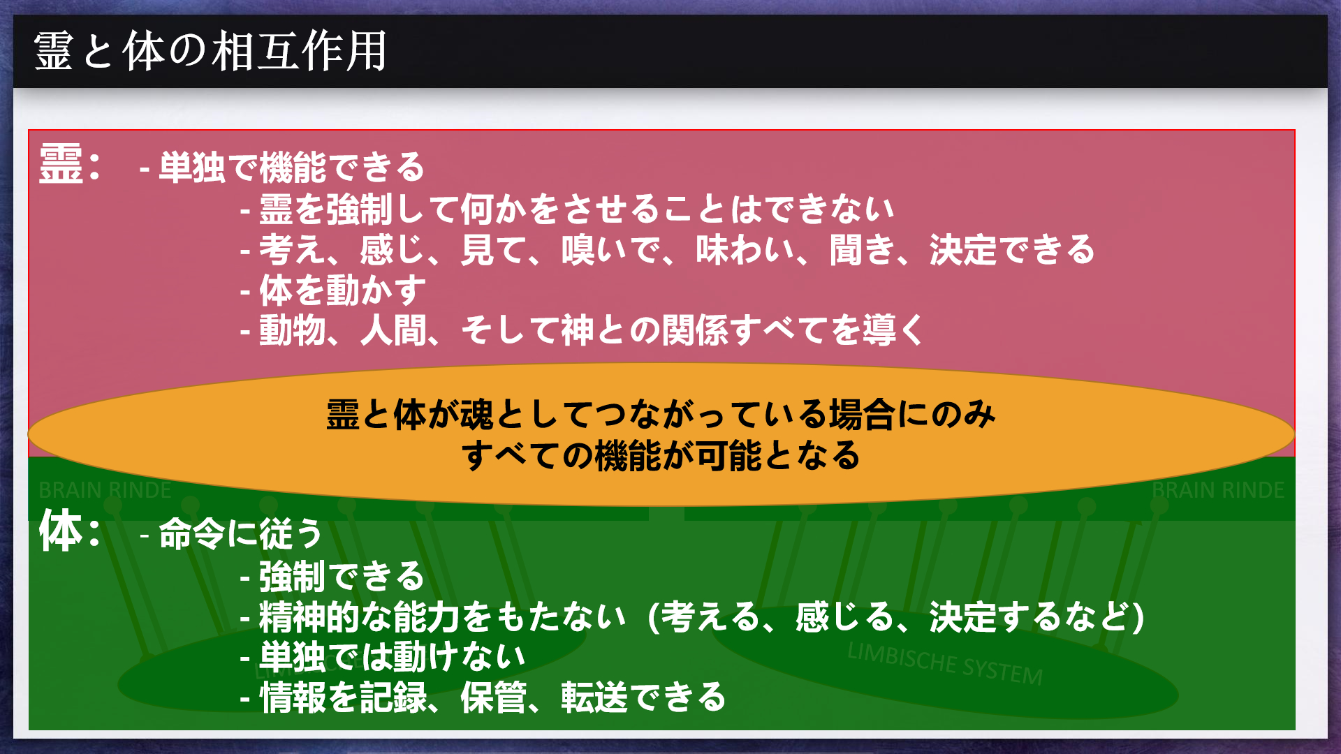 霊と体は機能的な単位を形成します。この二つの要素が機能するのは、一緒になったときだけです。それにもかかわらず、霊は体の上位にあり、体をコントロールしています。それでいて、体には霊が上書きできない固定の設定があります。これは、霊が体をコントロールしていても、体の限界を超えることはできないということを意味します。人間の霊は、このような理由で体によって制限され制約されているのです。