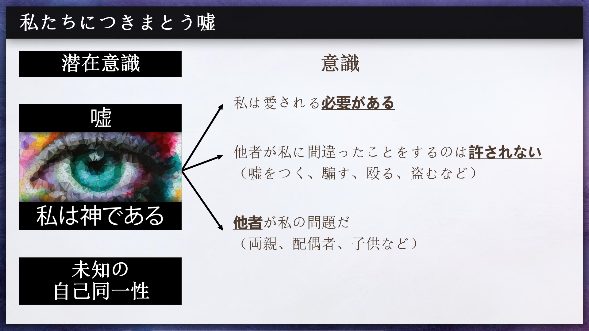 この誤りからは、別の嘘も生まれます。「他者が私に間違ったことをするのは許されない」という嘘です。これは、他者は「私」に嘘をついたり、「私」を騙したり、殴ったり、「私」から盗んだりしてはならないということを意味します。私は診療所でこの顕著な例に遭遇しました。
