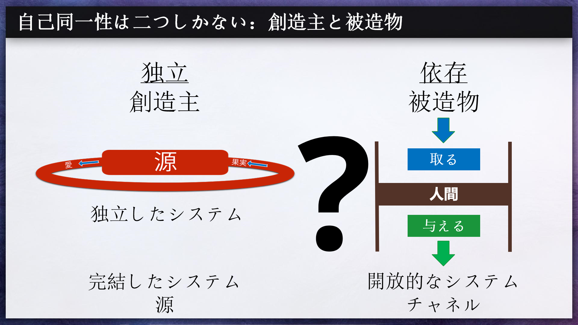 私たちの世界で根本的に可能な自己同一性は二つしかありません。人間は被造物、つまりチャネルであるか、あるいは創造主、つまり源となる神であるかのどちらかです。では、人間の霊は自分が誰だと信じているのでしょうか? 「私は被造物だ」と信じているか、あるいは「私は創造主だ」、つまり神だと信じているかのどちらかです。