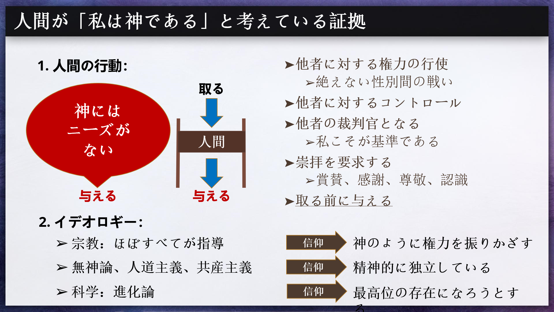 人間が自分を神だと考えているということを最も明確に示す証拠は、人が建前上は「取る前に与えている」場合です。神にはニーズがなく、与えるだけです。人間はチャネルであり、常に与える前に取らなければなりません。もし人間とは逆の行動を取るとしたら、その人は神のはずです。さもなければ、このように行動しないでしょう。