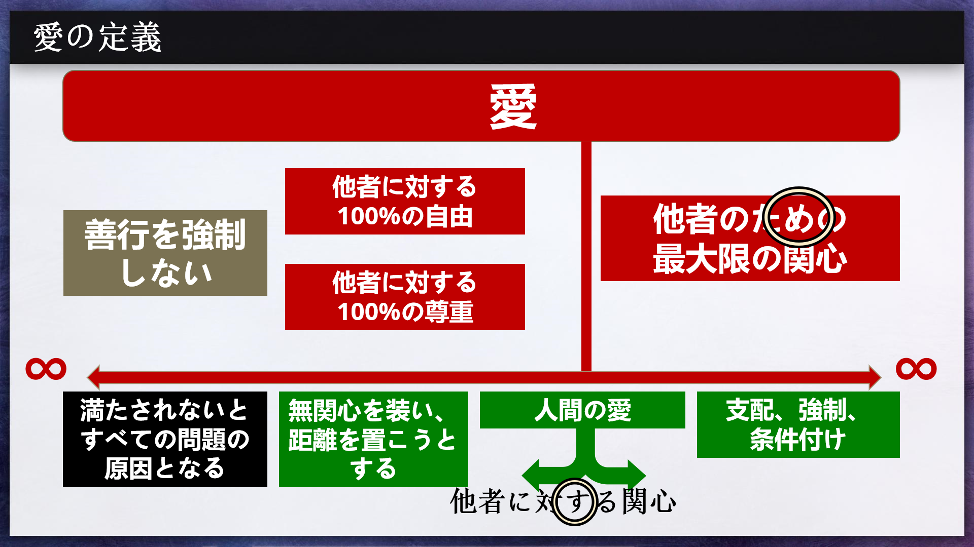 では、愛とは何でしょうか? 私の定義は、関心と自由という二つの次元を結合します。どちらも限界がなく、それゆえ無限です。もし私たちがこの形で愛を実践したら、誰からも害されない、自由な存在となれるでしょう。愛はすべての人間の問題に対する解決策です。愛は他者に対する最大の関心を伴います。しかし、なぜ関心が愛にとって重要なのでしょうか?