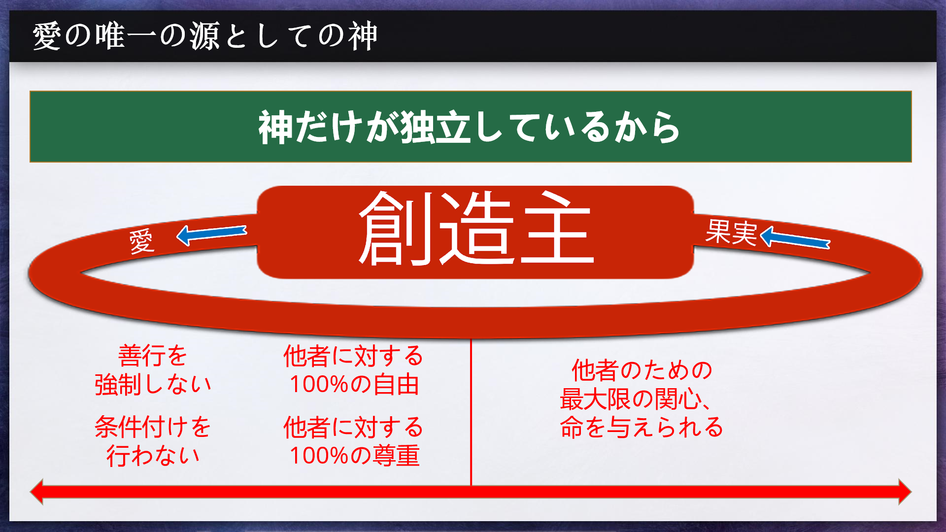 神だけが独立しているため、神は無制限にすべての被造物に愛を提供できます。誰もが最初に愛を取り入れ、それを伝えることで愛を実践できます。人は愛をどこで与えるかを自由に決められますが、その使用自体は自分の命に関わる条件なのです。