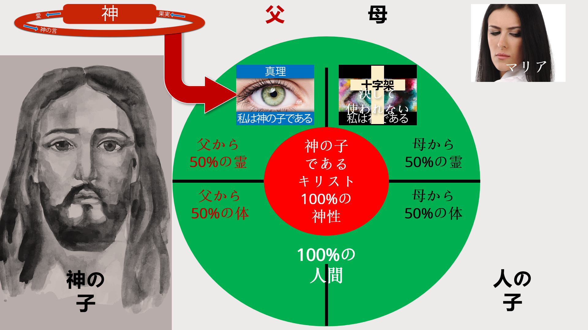 ところが、遺伝の法則に従って、イエス様は母親のマリアからも誤りを受け継がれました。しかし、イエス様はこの偽の自己同一性を[決して]{.underline}使用せず、それをご自身の内で破壊しなければなりませんでした。地上で過ごす間、イエス様は人間としての存在において、完全に神であったにもかかわらず、「神であることを望む」という誘惑に抵抗しなければなりませんでした。イエス様が永遠の神として存在していたという点を理解するのは重要です。イエス様は衣服を着るかのように、人間性によってその神性を隠しました。イエス様の人間性は見えるものとなり、その神性は隠されたのです。これによって、イエス様は一方では神の子、他方ではマリアの側からアダムの子孫となられました。