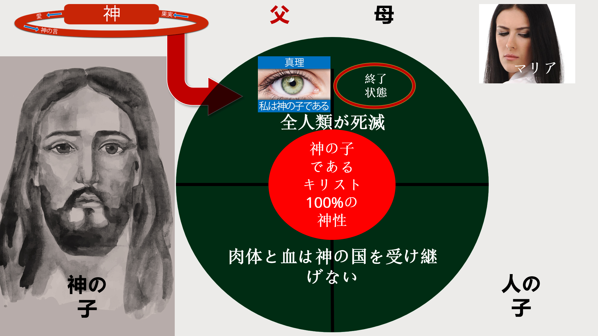 聖霊によってマリアの胎内にイエス様を宿らせたのは、人間に出口を与える唯一の方法でした。遺伝の法則に従って、イエス様は父なる神によって宿ったことで、ご自身についての真理、すなわち「私は父の子である」という真の自己同一性を受け継がれました。この真理を通して、胚は神と結びついたのです。これにより、地上の父親によって宿った子供には決して克服できなかった障壁が取り除かれたのです。イエス様という人は父と結ばれ、正しい生理的な結合を果たしたのです。