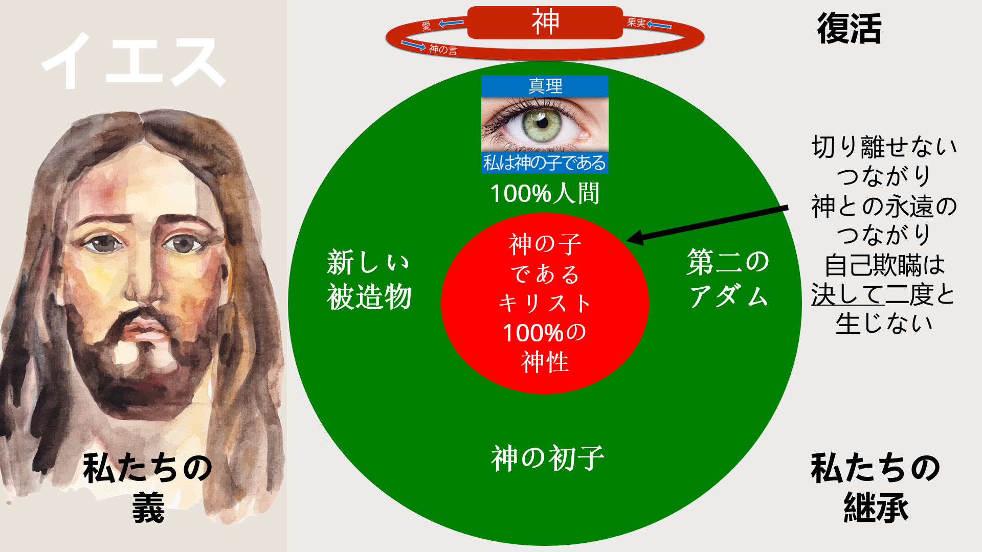 三日目の復活によって、キリストは第二のアダム、つまり命を与える霊(コリントの信徒への手紙一15章45節)となられました。キリストは、死者の中からよみがえられたとき、不死の存在となり、永遠に神と結ばれ、新しい被造物となられました。こうしてキリストは今や永遠に真理の中に存在します。キリストは神の初子です。この素晴らしいメッセージが意味するのは、私たち全員がイエス様への信仰を通して神の息子、娘になるということです。それが私たちの救済なのです。人間にとって他の可能性はありません。この一つの新しい命こそが、私たちに必要なすべてなのです! もし古き人間がそれを信仰によって受け入れるなら、新しい人間は神の性質にあずかるのです。私たちの義と希望のすべてはキリストの中だけにあるのです。キリストの新しい命は、私たちを神の臨在へと連れ戻してくれます。