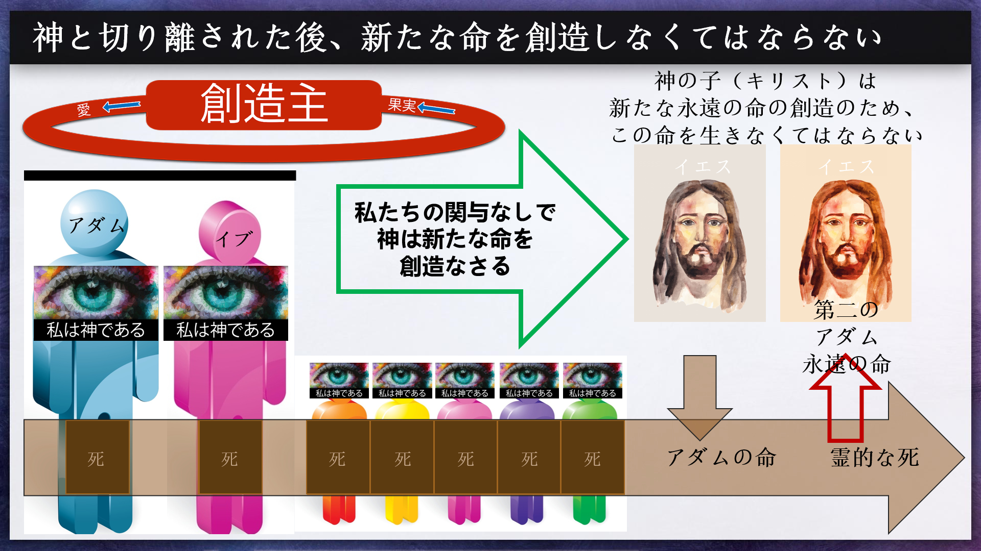 神はイエス様の復活によって創造された新しい命をすべての人に示し、その人たちが新しい命を信仰によって受け入れられるようにしています。この新しい命を信仰によって受け取ることが、人間のありとあらゆる問題に対する解決策なのです。人間の堕落によってアダムとイブから始まり、すべての子孫に影響を与える神からの分離は、人間の努力によって元に戻すことはできません。神に帰ることは、私たちにとって不可能なことです——つまり、私たちは死ななければなりません。唯一の出口は、イエス様の命を信仰によって受け入れることなのです。