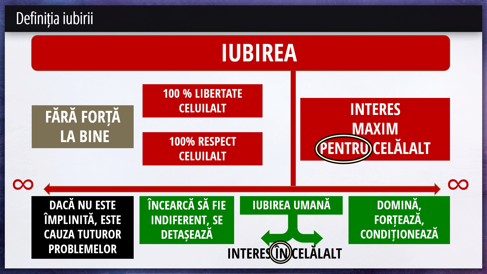 Iubirea trebuie să aibă un interes maxim față de cealaltă persoană. Dar iubirea umană (egoismul) este, de asemenea, capabilă să manifeste un interes maxim față de cealaltă persoană. Cu toate acestea, egoismul manifestă un interes în celălalt, nu pentru celălalt. Orice mamă își iubește copilul. Dar vrea ea ceva de la copilul ei sau nu vrea nimic? Știm că mamele și-ar da viața pentru copiii lor, deoarece sunt atașate de ei. Cu toate acestea, atunci când copiii nu fac ceea ce se așteaptă de la ei, mamele intervin de cele mai multe ori. Marea majoritate a pacienților mei spun că au sau au avut o mamă dominantă. Mamele sunt capabile să îi constrângă și să îi condiționeze pe copii. Dar niciunei ființe umane nu-i place să fie condiționată.