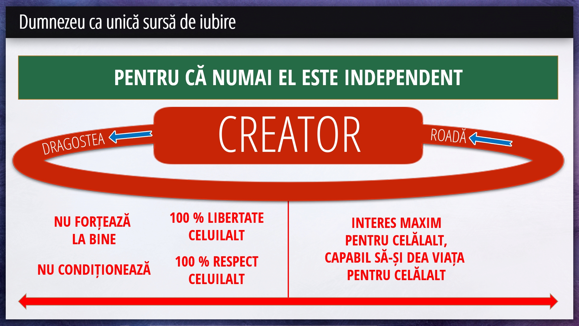 Iubirea ne face complet liberi dacă o practicăm în mod corect. Ești liber atunci când dai libertate. Dacă nu o poți oferi, nu ai nici tu libertate, pentru că atunci ești dependent de persoana căreia nu-i dai libertate și, prin urmare, nici iubire. De aceea, voi fi întotdeauna independent de persoanele pe care le iubesc cu adevărat. Aceasta este condiția. Dacă iubești într-un mod uman (egoist), vei putea lăsa cealaltă persoană să greșească, de exemplu să risipească bani? Testul pentru a afla dacă iubirea este adevărată se dă în punctul privind libertatea. Acolo unde nu poți da libertate, există o dependență față de cealaltă persoană, pentru că, evident, vreau ceva de la ea. Cel care are o iubire în care există simultan interes maxim pentru celălalt și libertate va fi independent. Cu toate acestea, doar unul singur este cu adevărat independent: Dumnezeu, Creatorul.